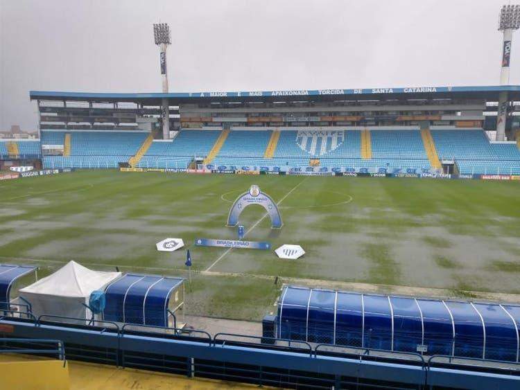 A chuva intensa na capital catarinense deixou o gramado impraticável para a realização da partida.